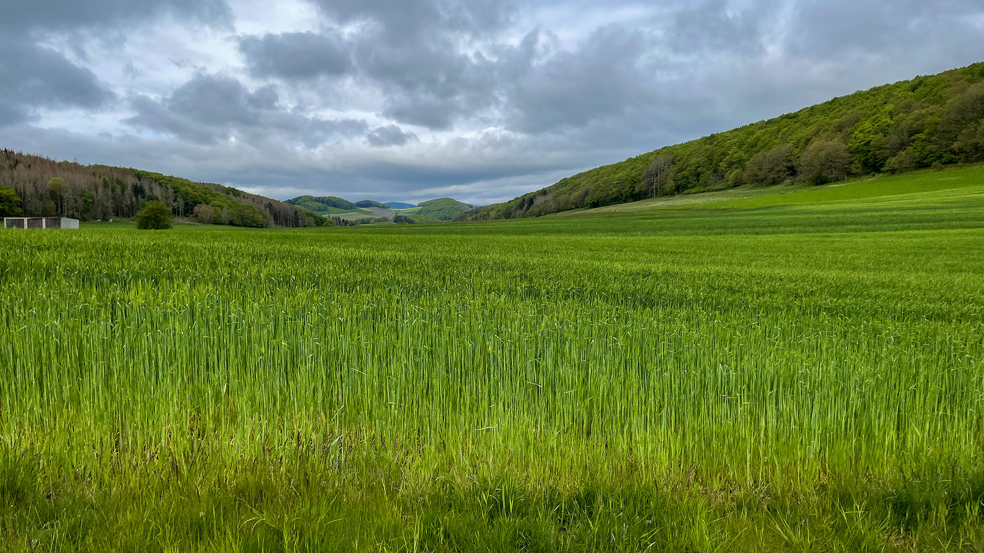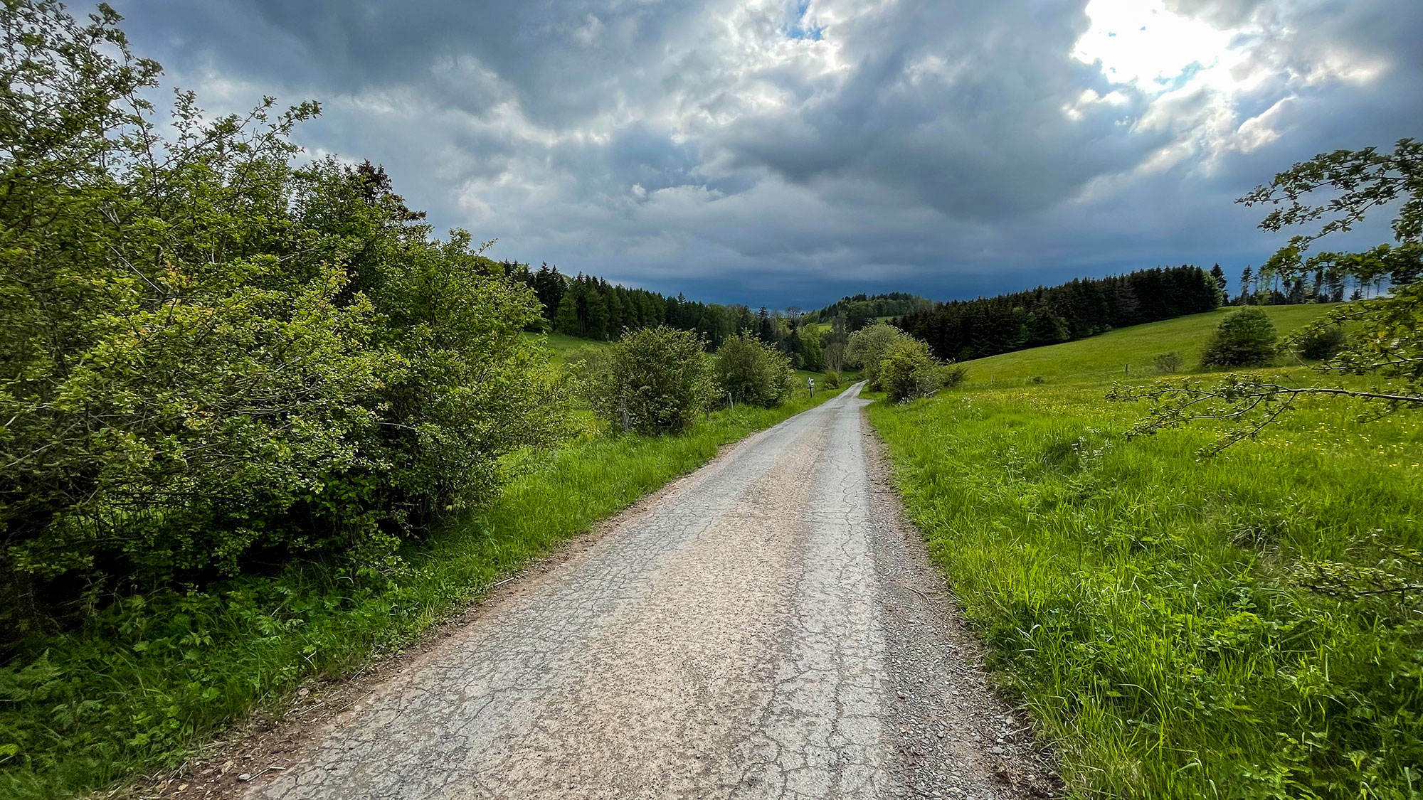 Direkt geht es auf einem Weg zwischen weitläufigen Ackerflächen hindurch, begrenzt von Wäldchen an beiden Seiten. In genauso einer Landschaft hat uns gestern der Sturm überrascht.