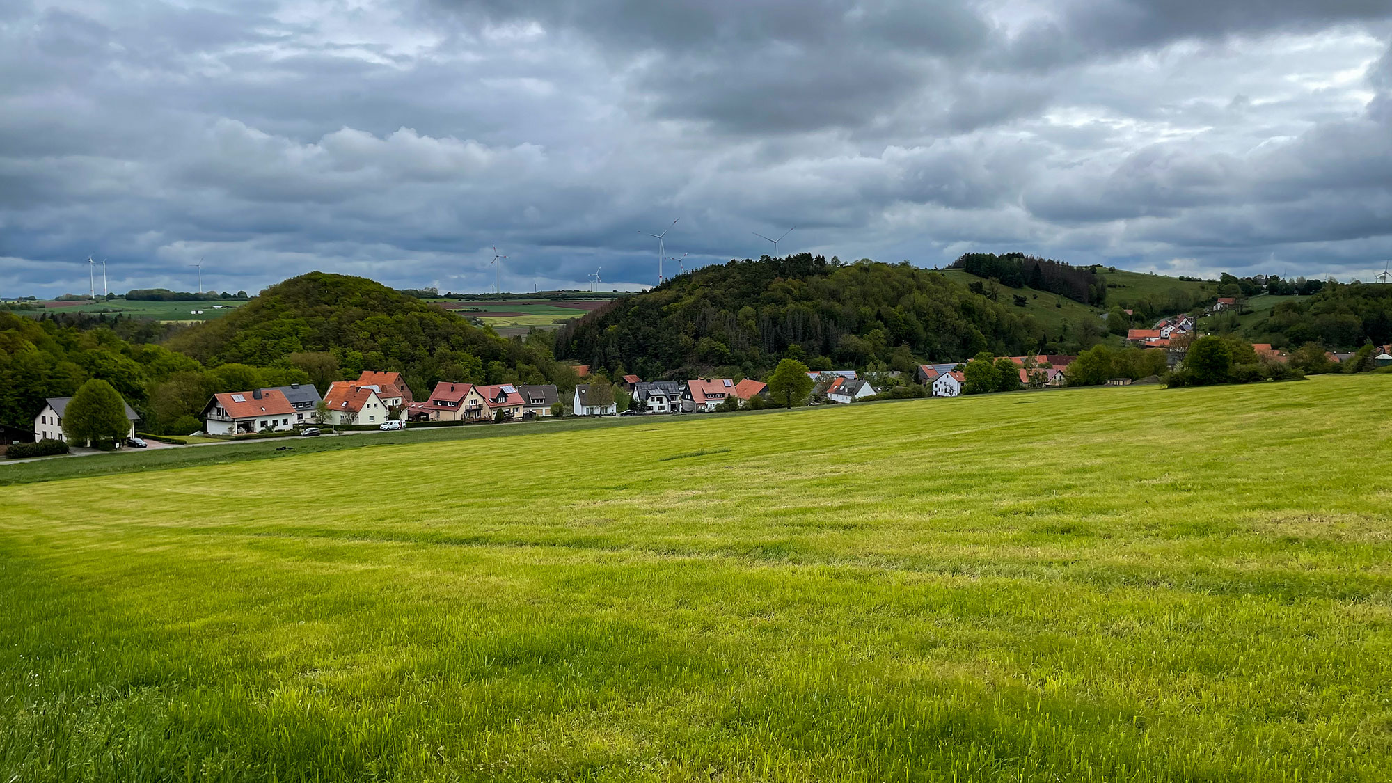 Es geht sich gut heute Morgen, die Temperatur ist perfekt zum Wandern, und so vergehen die ersten Kilometer wie im Flug. Wieder passieren wir eine freie Fläche, wieder geht es durch ein kleines Waldstück, und dann stehen wir erneut vor einer von Wald begrenzten Hochebene, die leicht zum Städtchen abfällt. Pferde, Äcker und ein paar Windräder auf der Höhe. Das letzte Stück ist ein enger und steiler, und vom Regen rutschiger schmaler Pfad. Mozart ist mal wieder klasse, ich gehe vorsichtig vor, und er wartet geduldig auf meine Aufforderung zu mir aufzurücken.