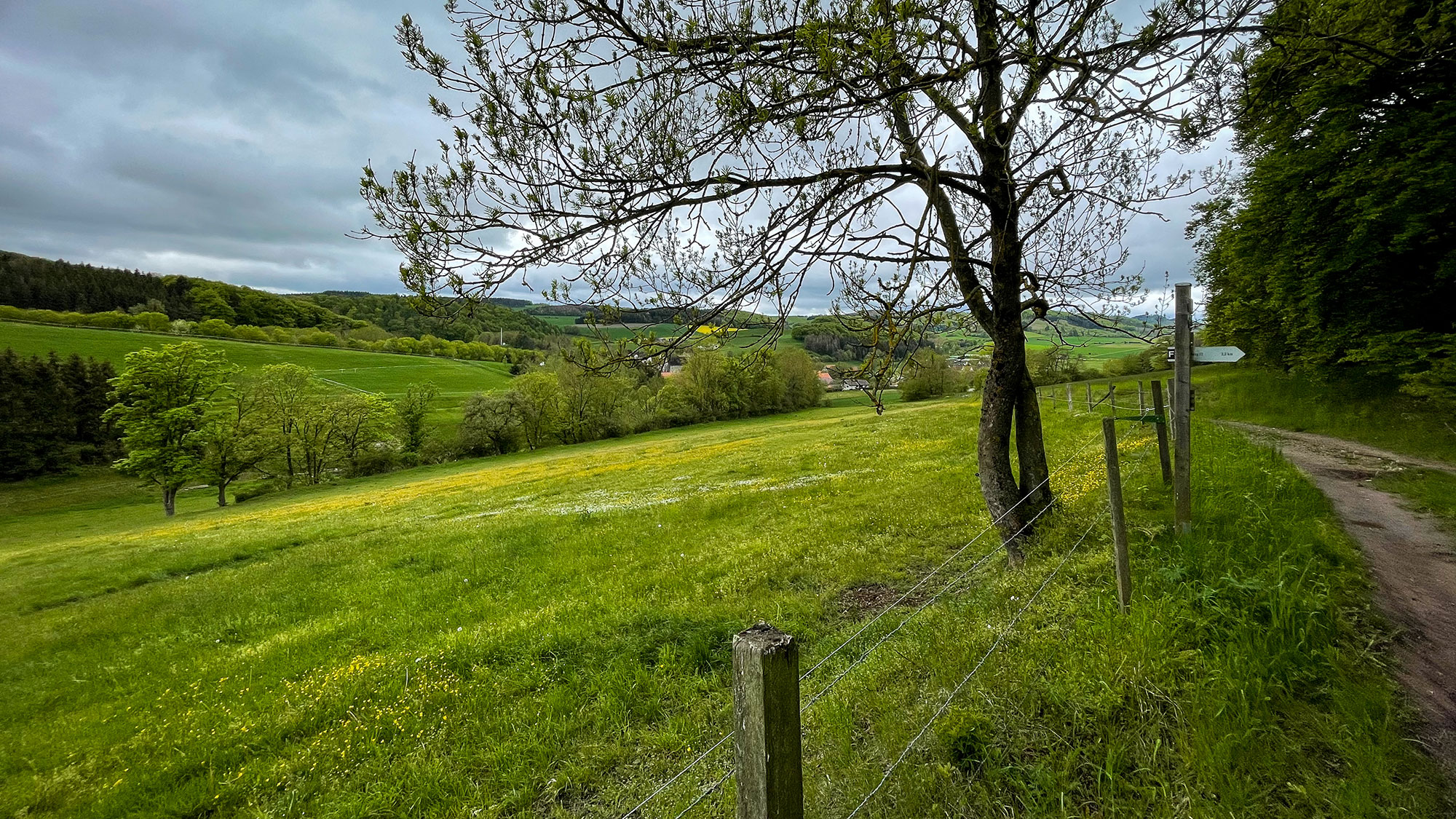Schnell nähern uns dem Örtchen Wirmighausen, biegen aber noch vor den ersten Häusern ab und gehen weiter hinauf. Danach folgt der Weg leicht ansteigend dem hohen Tal und endet vor einem Mischwald, den wir nun durchqueren. Erst geht es leicht bergab, nach einer Biegung wieder hinauf. Neben uns hören wir ab und zu Fahrzeuge auf der Landstraße nach Flechtdorf, unserem nächsten Ziel.