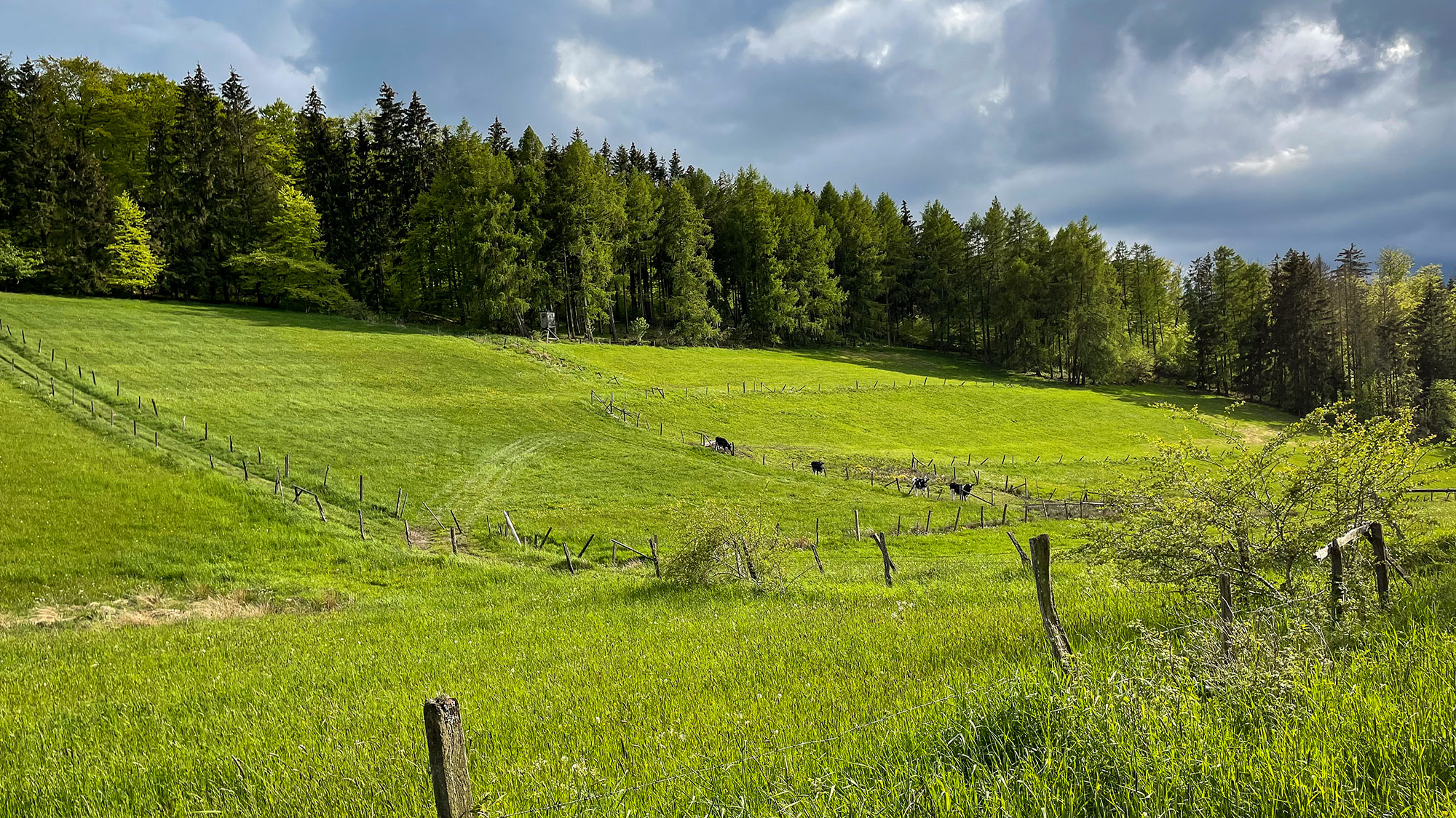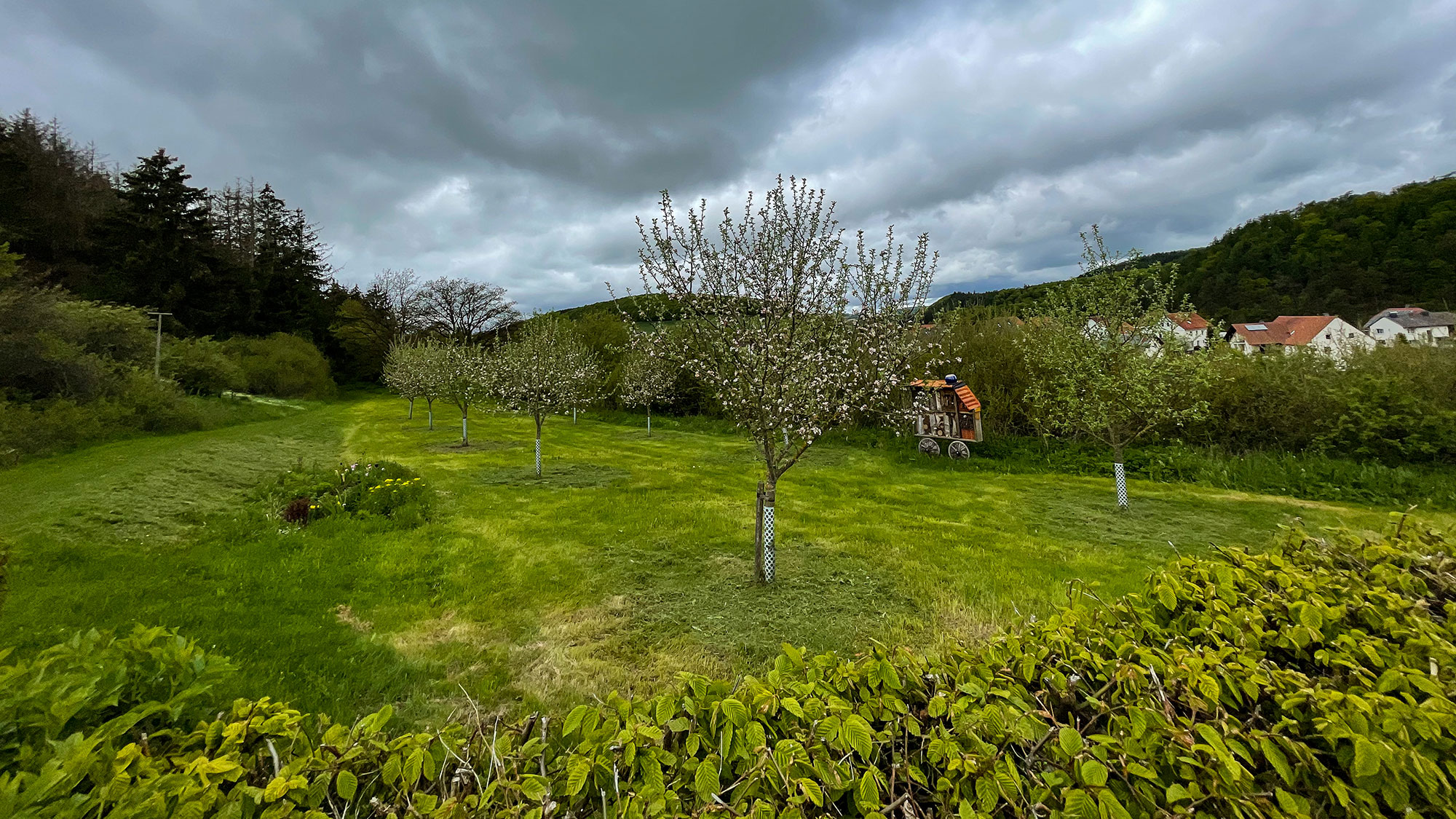 Am Friedhof und blühenden Obstbäumen vorbei ziehen wir hinauf zum Mittelsberg. Echt krass, wenn man sich die Landschaft auf der Karte anschaut, liegen die Wälder und die Ackerflächen wie Streifen übereinander. Südlich sieht man auf einer Anhöhe eine Konstruktion, der Turm des meteorologischen Dienst.