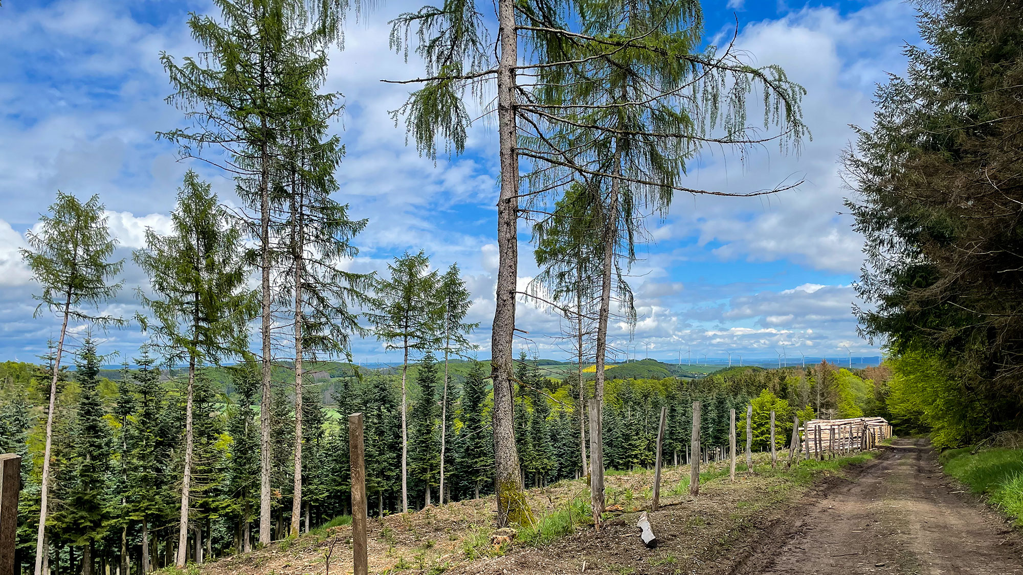Am Mittelsberg herrscht Chaos, Abholzungen und die typischen Narben im Boden und auf dem Weg verstreute Fichtenzweige. Das ist und bleib aber die einzige Abholzung, auf die wir auf dem kompletten Upland- und Diemelsteig treffen.