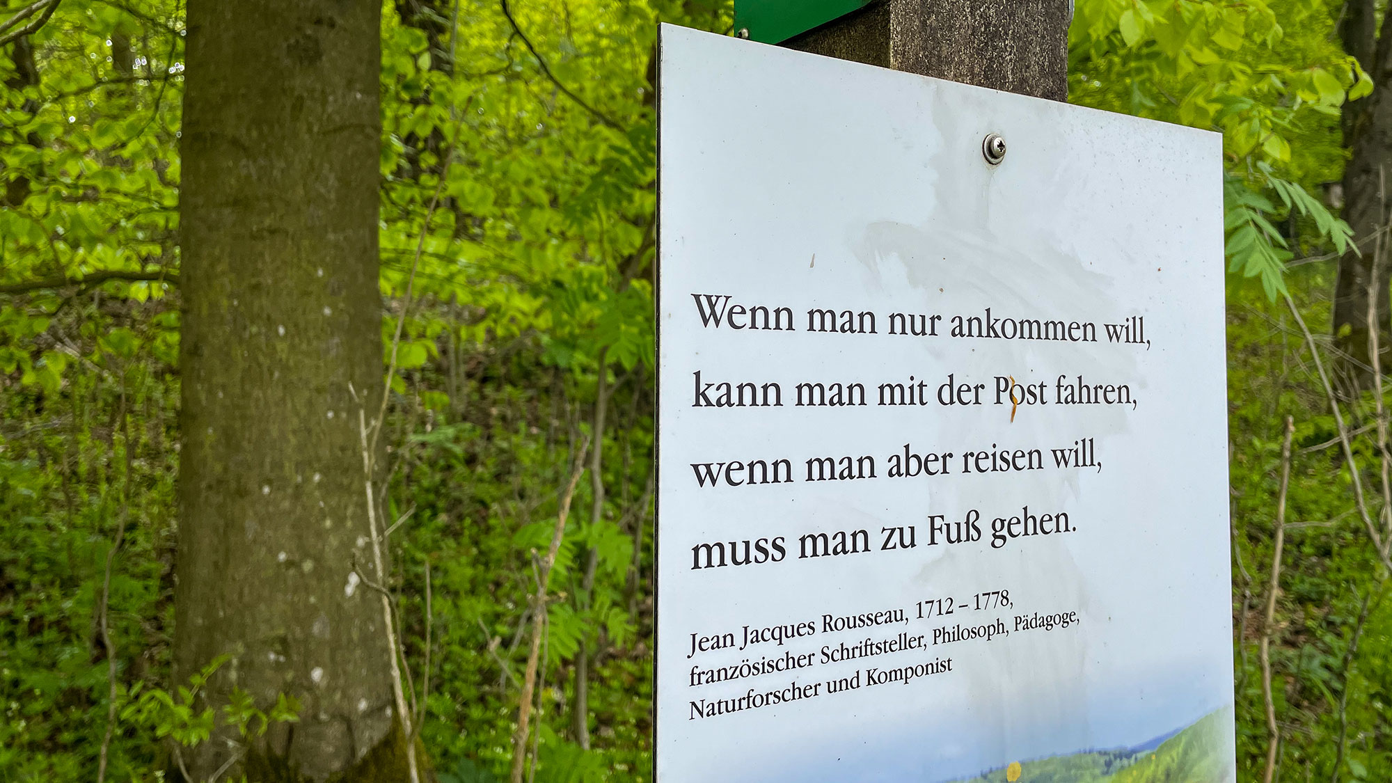 Nachdem der Weg zweimal abknickt, befinden wir uns laut Infotafel auf dem Weg der Stille. Noch begreife ich nicht warum der Weg so benannt wurde. Vor mir liegt ein ganz gängiger breiter Waldweg, der schnurgerade durch den teilweise lichten Wald mit Fichten und Buchen führt. Eine erste Spruchtafel von Rousseau lässt mich schmunzeln und das Handy zücken.