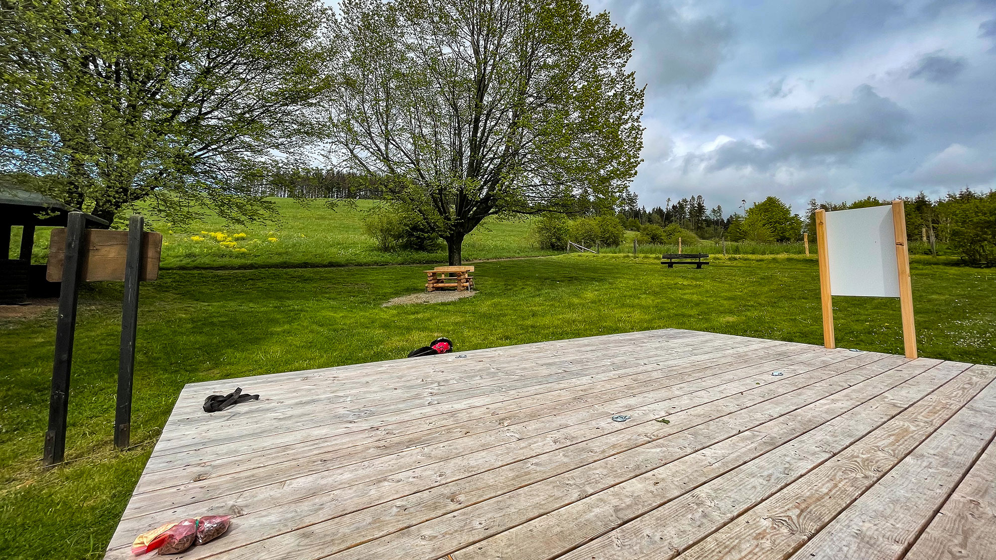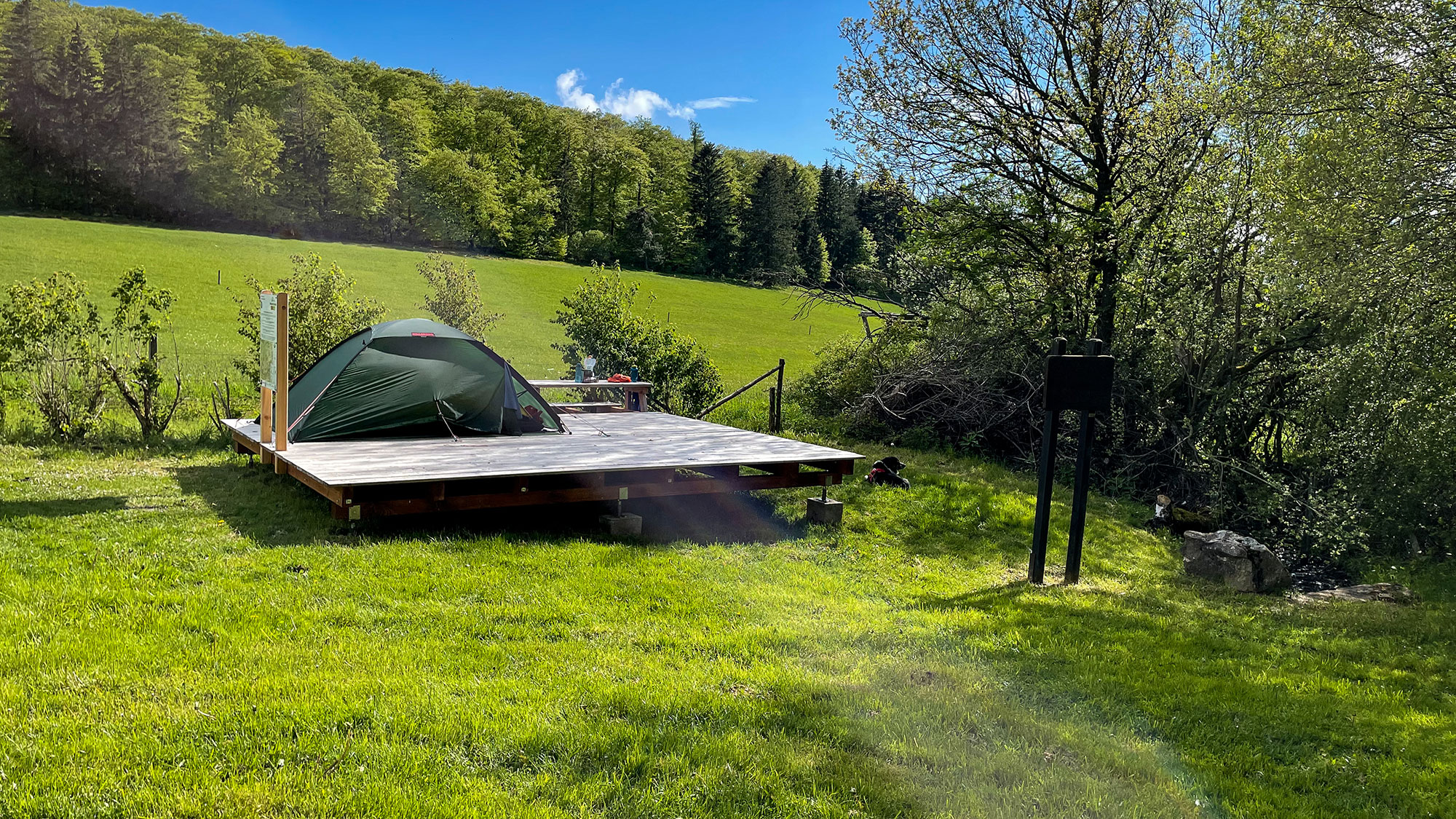 Die Ankunft am Trekkingplatz-Rhenequelle-bei-Schweinsbühl ist einfach nur WOW! Auf einer Wiese stehen verteilt eine Schutzhütte, eine Sitzbank mit Tisch, die Holzplattform und eine Komposttoilette. Luxus!