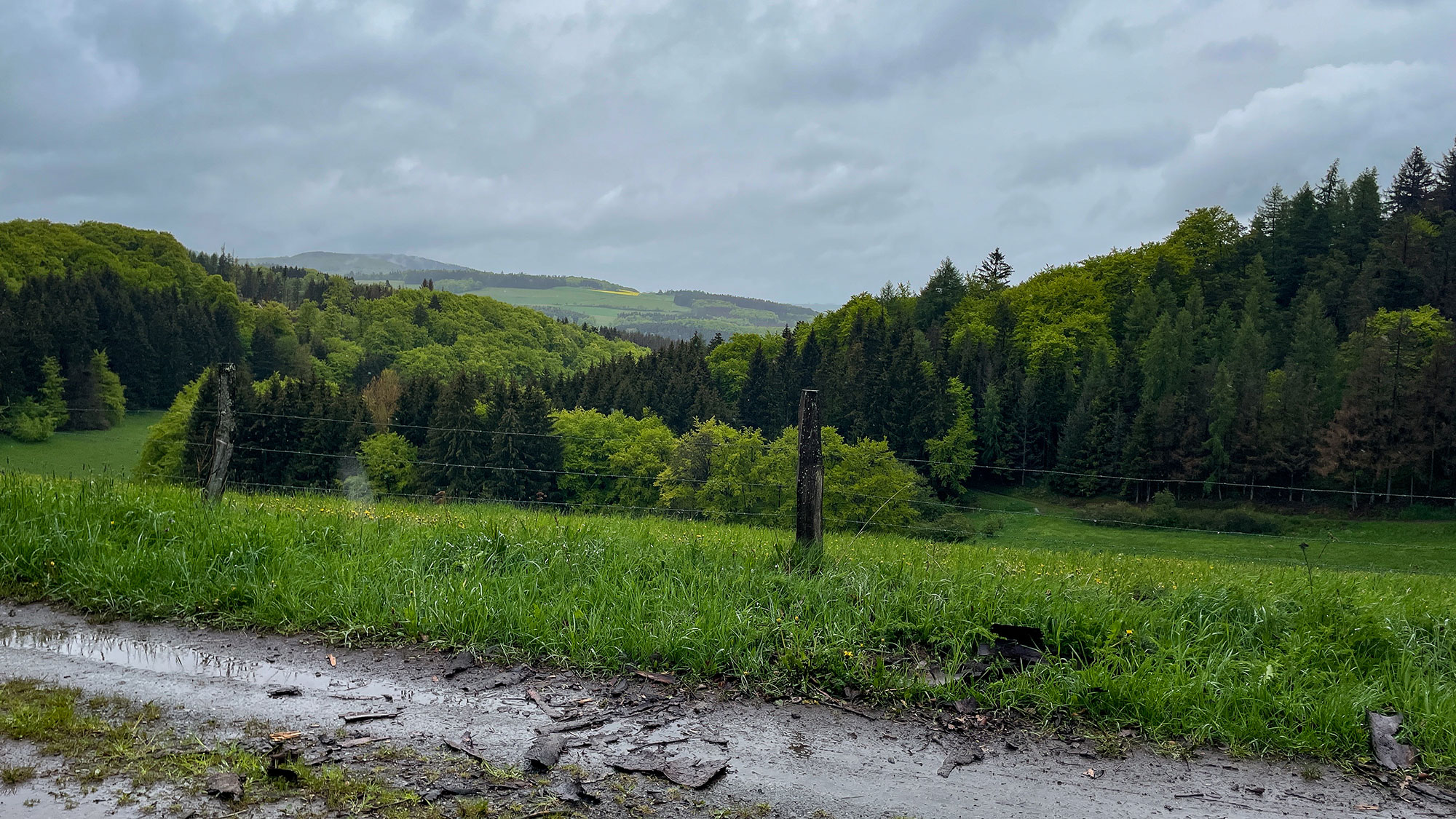 Wo war ich nochmal, ach ja, falscher Weg, der Diemelsteig verläuft geschätzt 100 – 150 Meter oberhalb von uns, da will ich hin. Zuerst geht es noch einigermaßen bequem an einem Zaun entlang, doch dann folgt eine Fichtenplantage, mit den unteren Äste in etwa auf Höhe meiner Taille, quetsch! Danach haben wir Glück, kein Zaun zur Weide, und ein Hochsitz und eine Lücke im Stacheldrahtzaun, um auf dem Weg zu landen. Mozart hat das Großartig gemacht! Wir haben das Großartig gemacht, auch wenn meine Regenjacke und mein Raincover ziemlich verdreckt und verharzt sind.