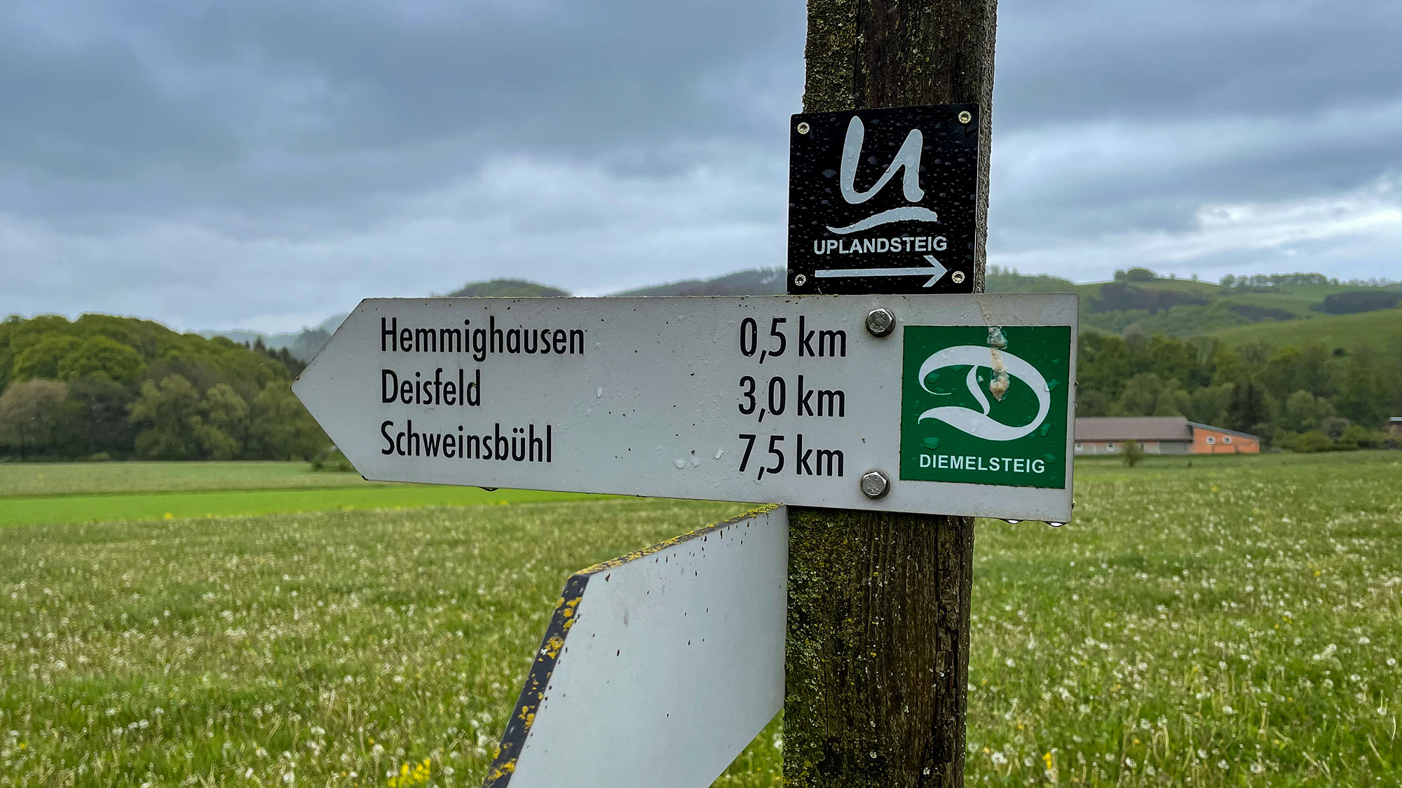 In Deisfeld mache ich eine kurze Snickers Pause in einem Wartehäuschen. Danach folgt ein offener Weg an Feldern und Wiesen in Sichtweite einer Landstraße entlang bis Hemminghausen. Ich erkenne das Örtchen wieder, durch das wir am ersten Tag auf dem Uplandsteig gekommen sind. Genau deshalb verlasse ich wieder unbeabsichtigt den Diemelsteig, treffe ihn aber oberhalb des Friedhofes wieder an.