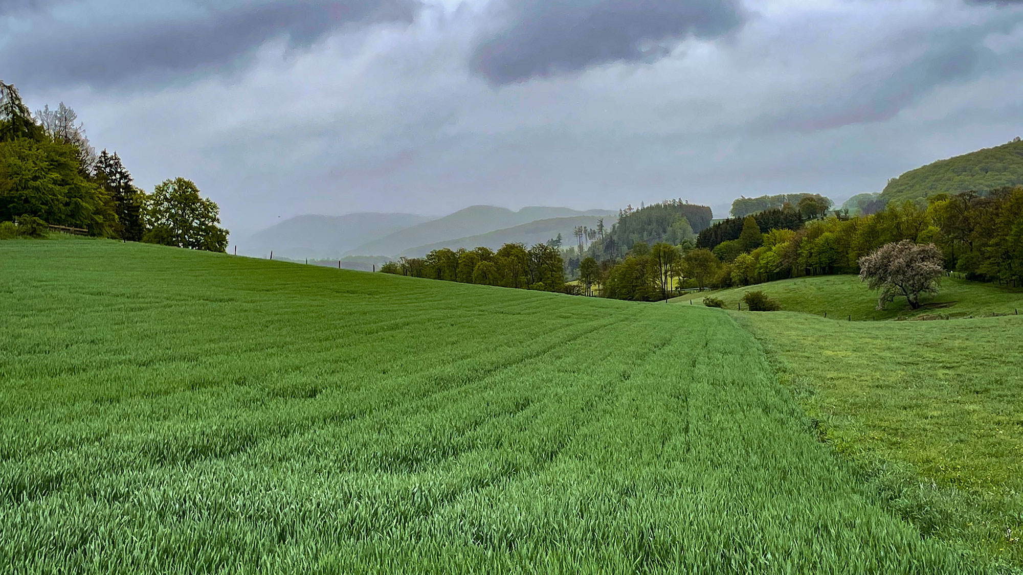 In einem Bogen führ uns der Weg um Schweinsbühl am Waldrand entlang. Südlich von Schweinsbühl treffen wir auf eine Landstraße, überqueren diese und folgen einem Wiesenpfad. Danach muss es irgendwie passiert sein, ich bin vom Weg abgekommen. Blöd, mein Handy ist wasserdicht im Rucksack verstaut, also Rucksack ab, Raincover zur Seite schieben, Deckelfach öffnen, Drysack rausnehmen. Danach die Handlungsschritte in umgekehrter Reihenfolge durchführen.