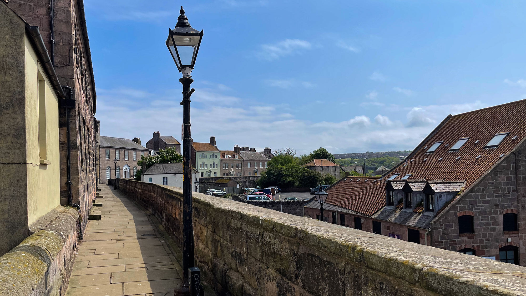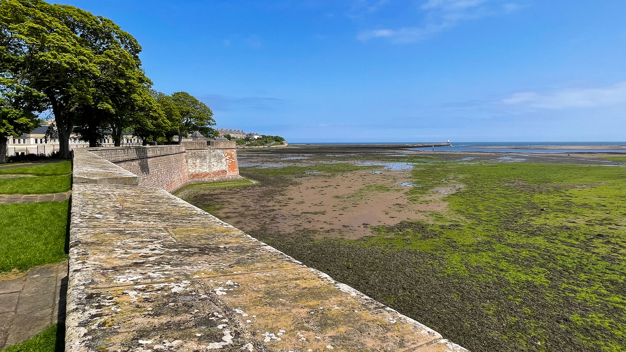 Über die Stadtmauer geht es weiter in Richtung Mündung, die so weit entfernt scheint. Nur Mozart ist nicht begeistert, ihm ist zu heiß. Die Sonne brennt ununterbrochen auf sein Fell und auch ich merke, dass es hier mit der UV-Strahlung zu viel wird. Also breche ich schweren Herzens ab, wir kehren um und machen noch einen Abstecher in die Stadt, über die es sicher viel zu erzählen gibt. Mal Englisch, mal Schottisch, immer hin und her und jetzt wieder Englisch. Komisch, in Schottland beginnen alle Städte und Städtchen an einer Flussmündung mit Inver. Wer weiß, ob Berwick upon Tweed nicht mal Inverberwick hieß. Nur so ein Gedanke. Wegen des ganzen historischen Hin und Her gibt es hier Befestigungen, Burgen, alles, was eine umkämpfte Stadt so benötigt – hat.