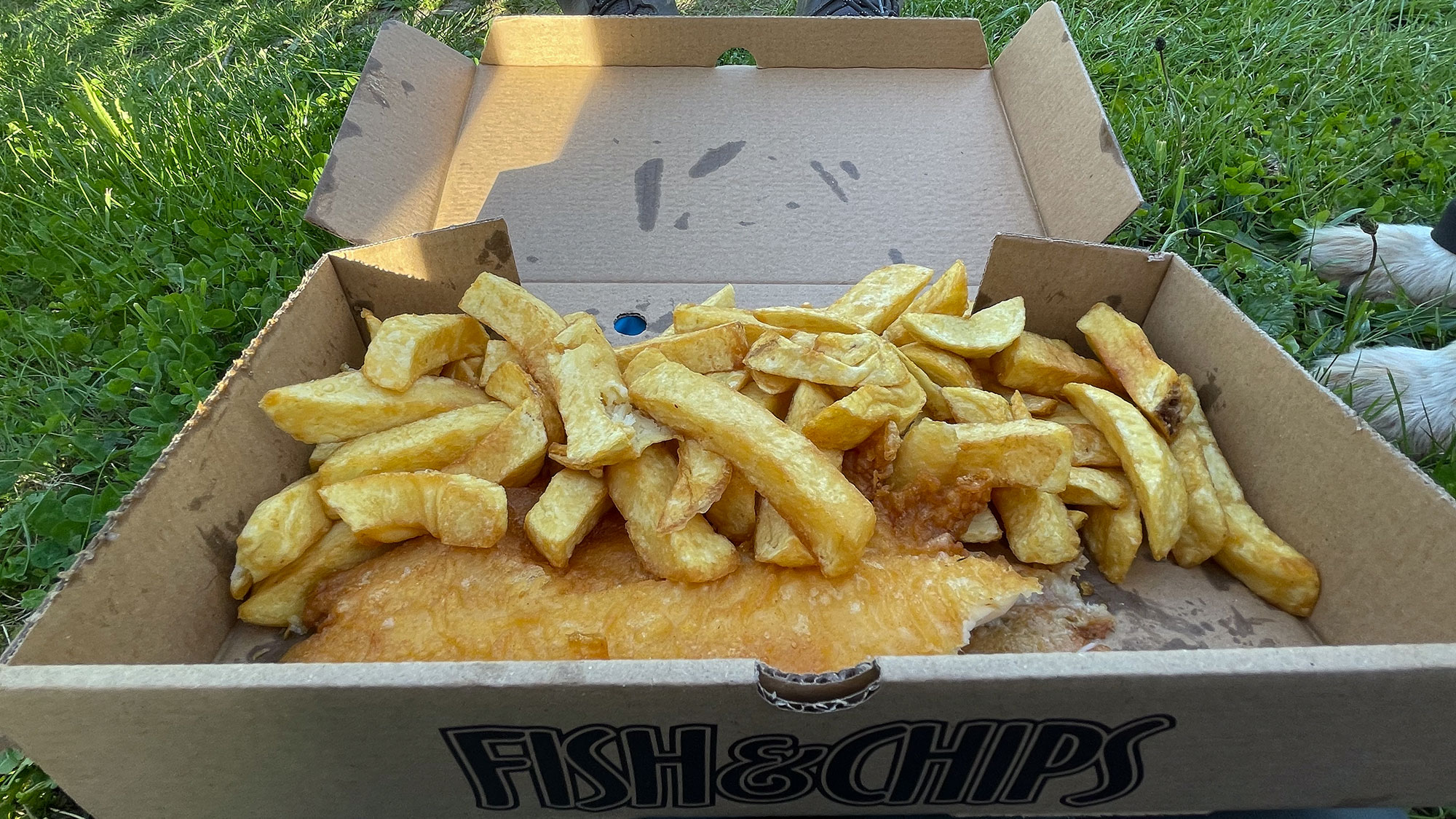 Der Abend bricht an. Im Rucksack habe ich noch die Tütenmalzeit von gestern, aber in der Nähe von frischer Nahrung habe ich darauf wenig Appetit. Neben der Registrierung steht ein silberner Imbisswagen, meine Hoffnung auf ein leckeres Abendessen. Leider geschlossen. Dann eben Fish and Chips bei „The Chippy“ am nördlichen Stadtrand von Aviemore, Google sei Dank, und so bekommt auch Mozart noch einen kleinen Abendspaziergang. Kleiner Tipp, nebenan gibt es auch einen Co-op, die eindeutig bessere Alternative zu Tesco.