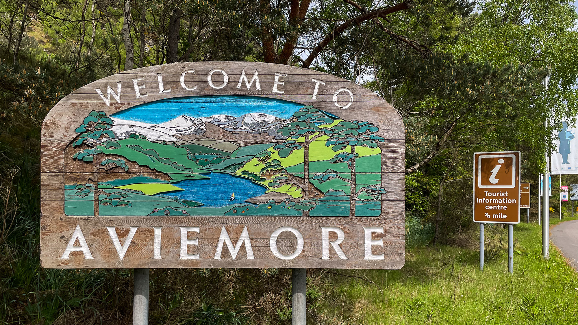Noch einmal wird die Stille unterbrochen, diesmal durch den dröhnenden Express-Liner. Kurz darauf erreichen wir ein Schild: „Welcome to Aviemore“. Willkommen im Lärm und Verkehr, immer entlang der Durchgangsstraße. Zweimal bin ich hier schon mit dem Auto durchgefahren, und jedes Mal hat mir die Stadt nicht gefallen, diesmal noch weniger. Jammern hilft nicht, wir müssen im wahrsten Sinne des Wortes hindurch. Kurz vor dem Bahnhof wird es auch auf den Gehsteigen immer voller, Mozart mag das gar nicht.