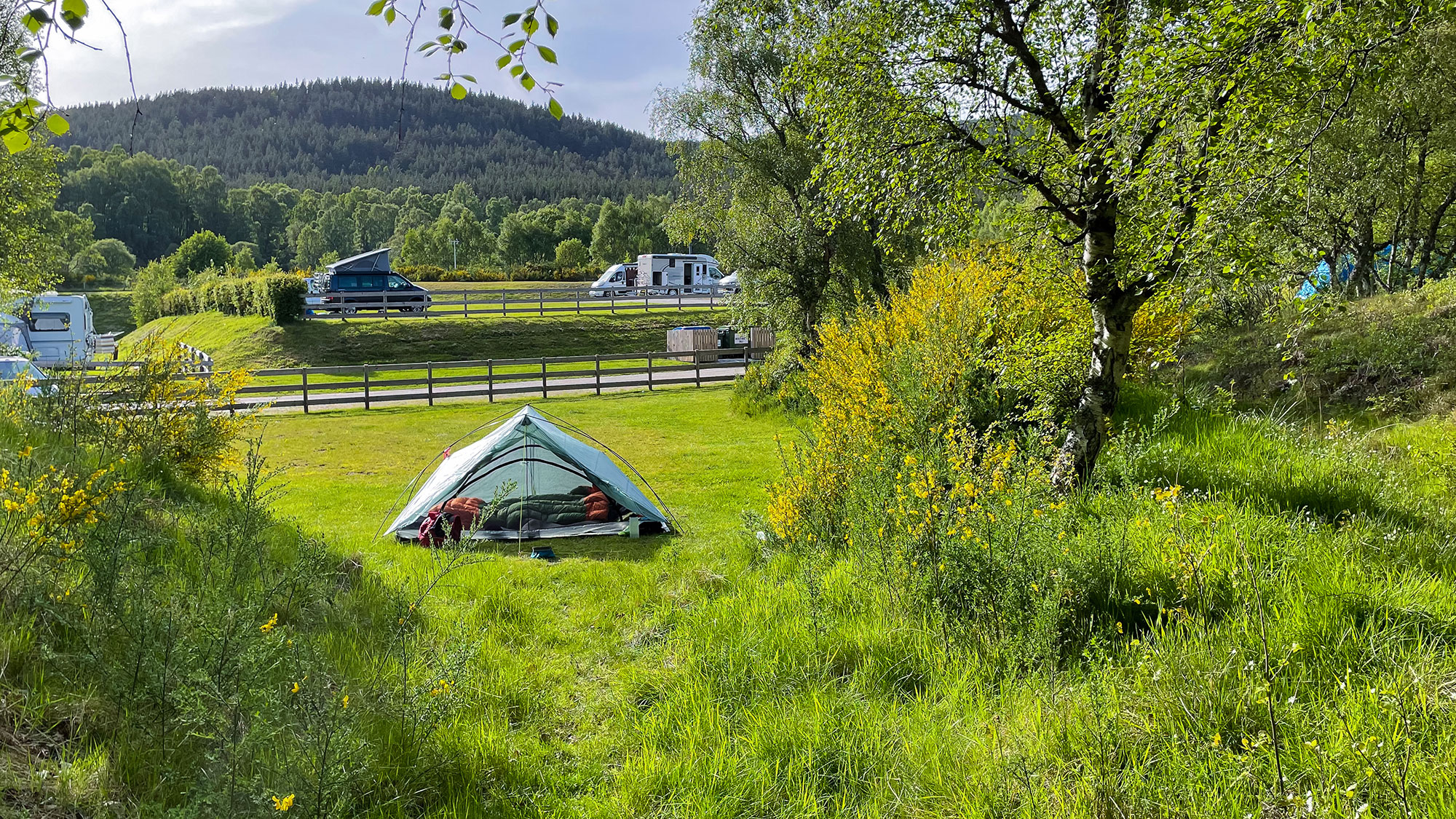 Gestresst und genervt, aber immerhin ohne quälenden Durst machen wir uns auf die letzten 3 km entlang der Straße zum Oakwood Camping nördlich der Stadt. Schade, dass der Speyside Way nicht um Aviemore herumführt. Kurz bevor sich der Wanderweg etwas von der Straße entfernt, sehe ich einen kleinen Minimarkt. Gesunde, nahrhafte Sachen gibt es dort kaum, aber immerhin landen Milch, 2 Äpfel und ein Schokoriegel in meinem Rucksack.