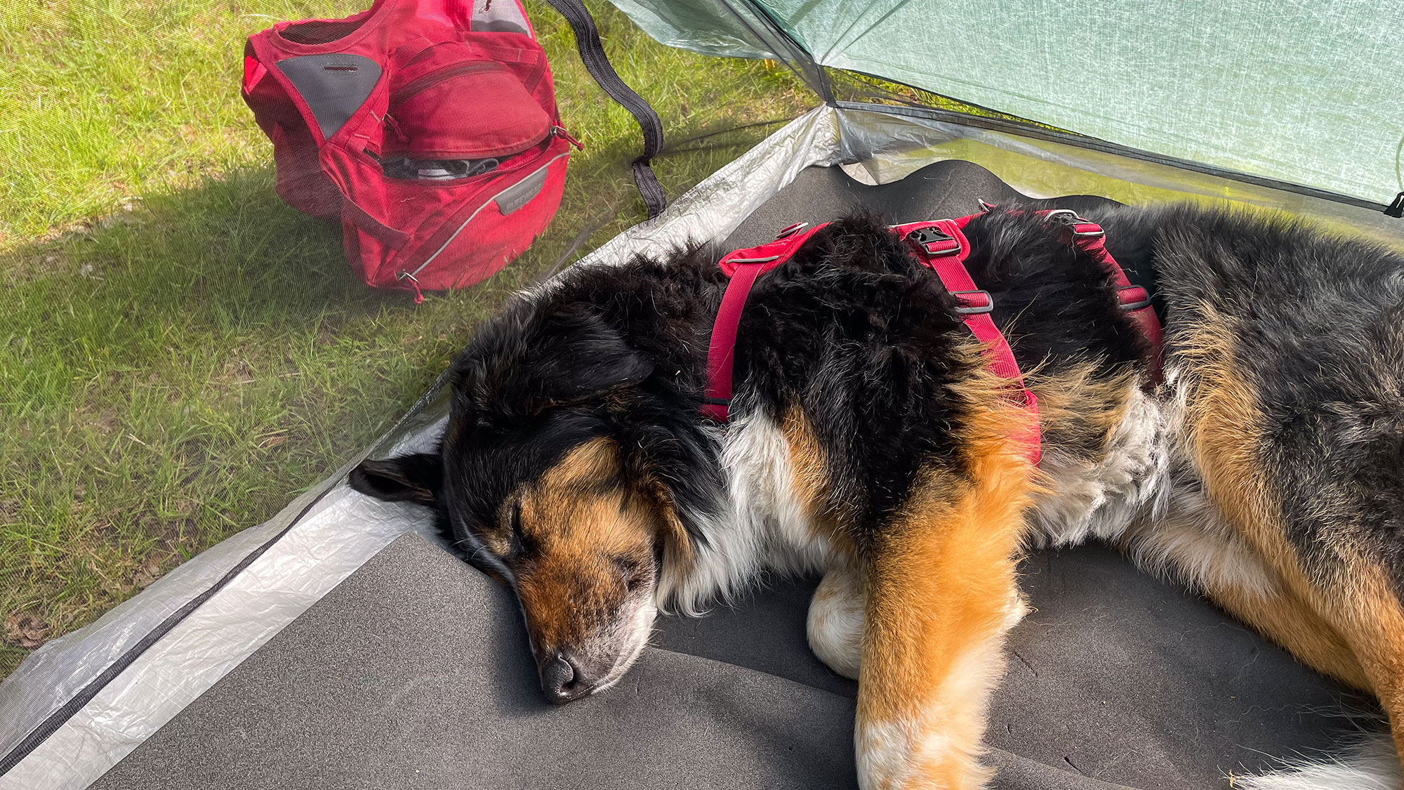 Mozart ist mit der Campingleine, einem Seil mit Karabinerhaken, angeleint, damit ich in Ruhe mein Zelt aufbauen kann. Aber was macht mein Hund? Er springt in einen sumpfigen Bach, um sich abzukühlen. „Matschepampe“ würden meine Enkelkinder jetzt sagen, und damit ist der ganze Hund verdreckt. Egal, ich muss sowieso Wasser holen, danach schnappe ich mir das kleine Mikrofasertuch für den Hund und schrubbe ihn ab. Danach können wir uns endlich für eine kleine Siesta ins Zelt legen und uns erholen.