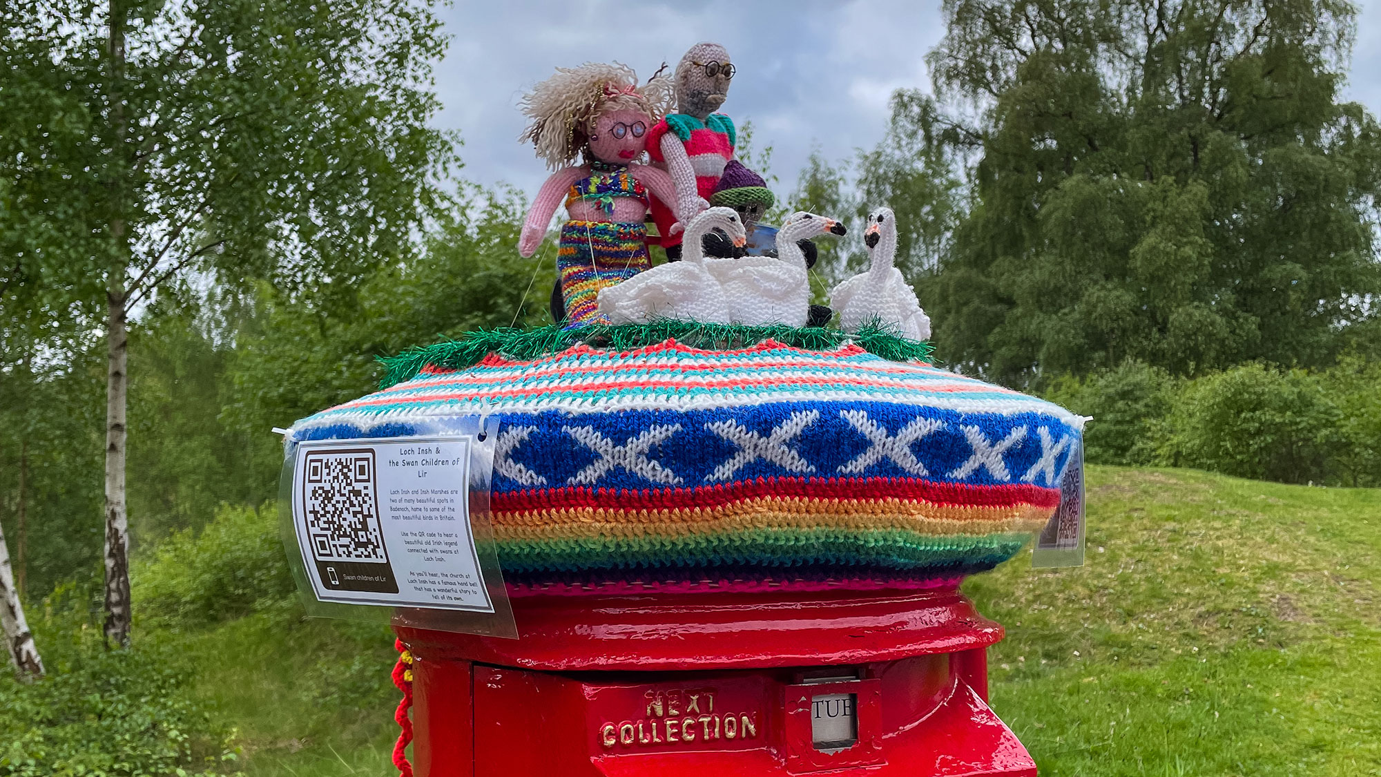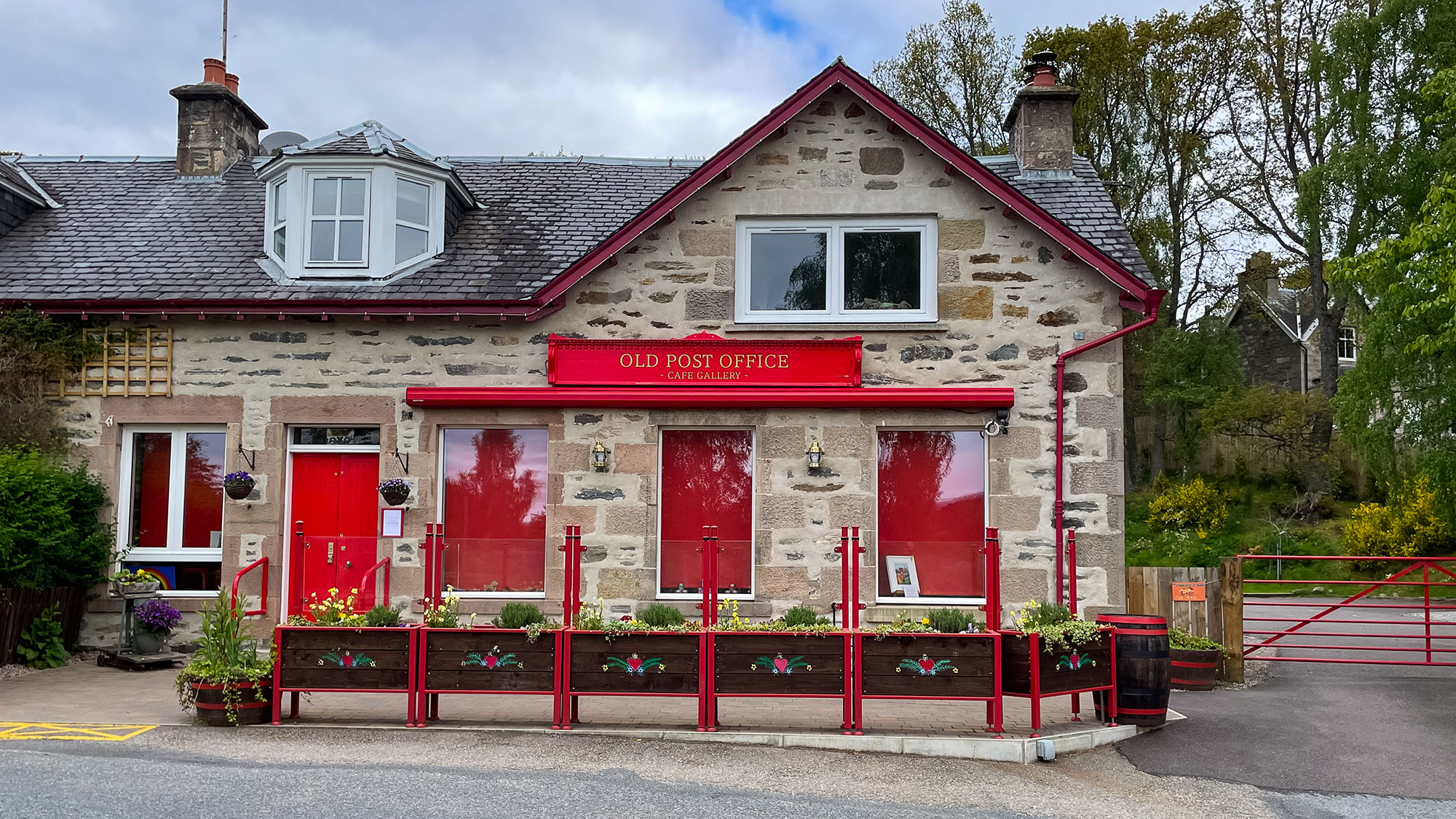 Vor Kincraig überqueren wir den Fluss Spey, es ist still und ruhig in dem kleinen Städtchen. Das Postoffice Café hat geschlossen, nur gut, dass ich im Outdoor-Center etwas gegessen habe, denn ein Tendmeals-Frühstück hatte ich für heute Morgen nicht eingeplant. An dieser Stelle sollte ich kurz erwähnen, dass ich für Frühstück und Abendessen nicht ausschließlich Trockenfutter eingeplant habe, sondern nur dann, wenn ich bei der Planung (Excel-Datei) keine Möglichkeit zum Einkaufen oder Essen gehen finden konnte. Auf der anderen Straßenseite steht ein roter Briefkasten, der an sich schon charmant ist. Dazu noch die Häckelmütze und die Babypuppen, auf sowas kommen nur die Briten.