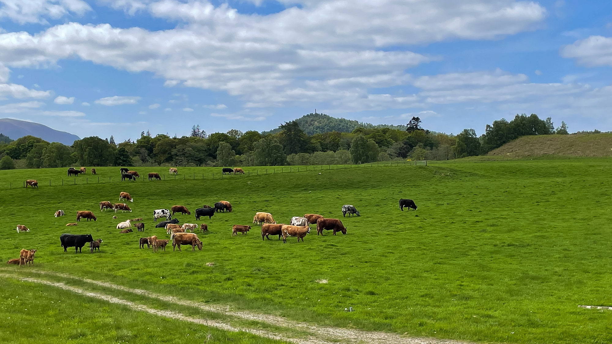 Anschließend beginnt der Abschnitt parallel und mal mehr, mal weniger nah an der Bahnlinie bis Aviemore. Das Teilstück, das der Schweizer Wanderer gestern so schön fand. Feiner, heller Kies, manchmal loser Untergrund und breit genug für 1 Person mit Hund. Schnurgerade bis zum riesigen Dalraddy Holiday Park, mit Blick auf Kuhweiden und die niedrigen Ausläufer des Cairngorms National Park im Hintergrund. Auf einem Hügel, Torr Alvie, steht ein Denkmal, das mich bei näherem Hinsehen an den alten Duke of Sutherland erinnert, bzw. an sein Monument das über Golspie tront. Später habe ich recherchiert, handelt es sich um den Herzog von Gordon, gestorben 1836.