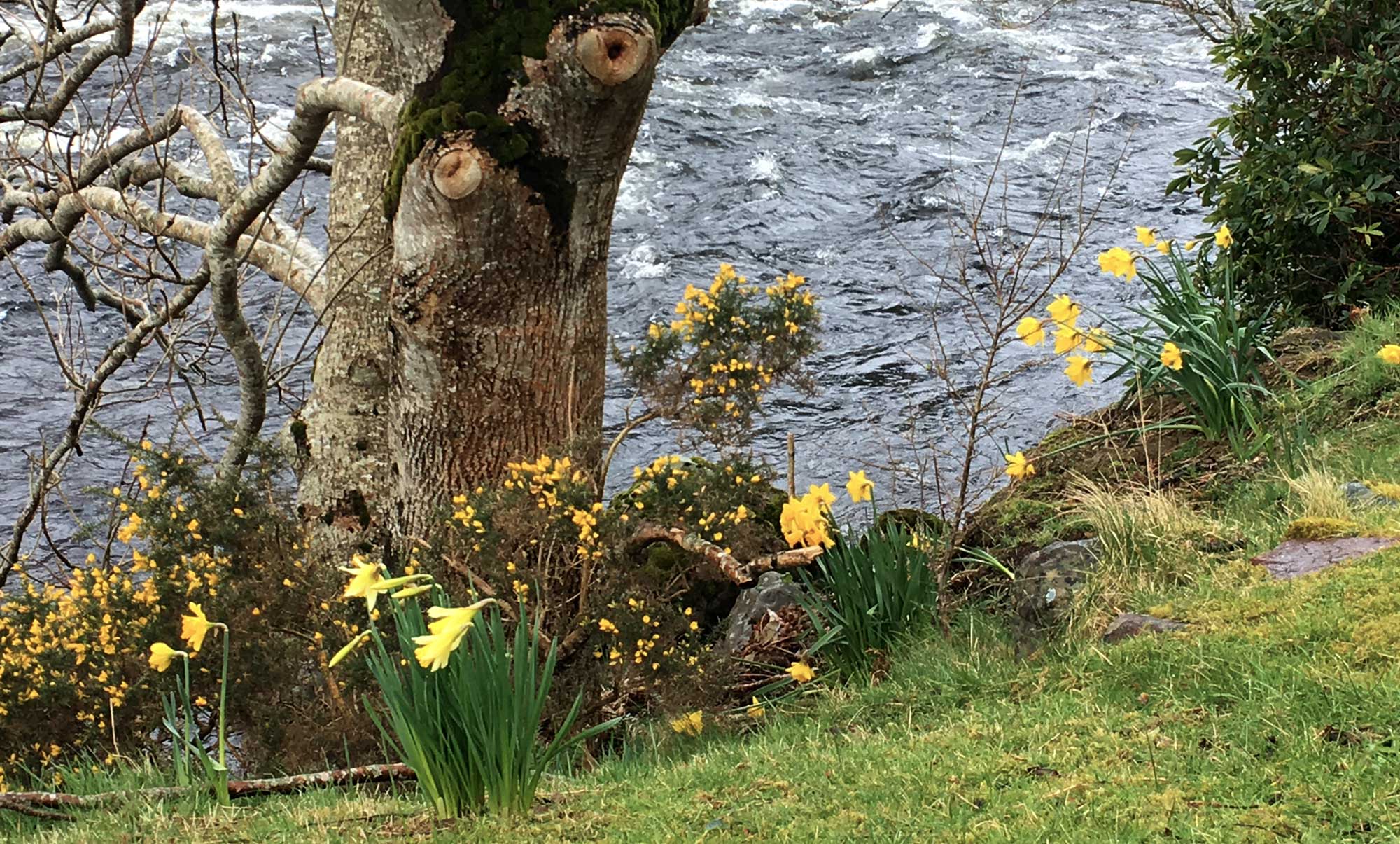Es ist schon fast Mittag (doch etwas Zeit vergammelt), ich parke in Poolewe am Bürgerhaus und wir folgen dem River Ewe flussaufwärts. Es nieselt, die Wolken hängen tief, kein gutes Wetter für Fotos. Trotzdem kann ich nicht umhin ein Narzissen Foto zu schießen.