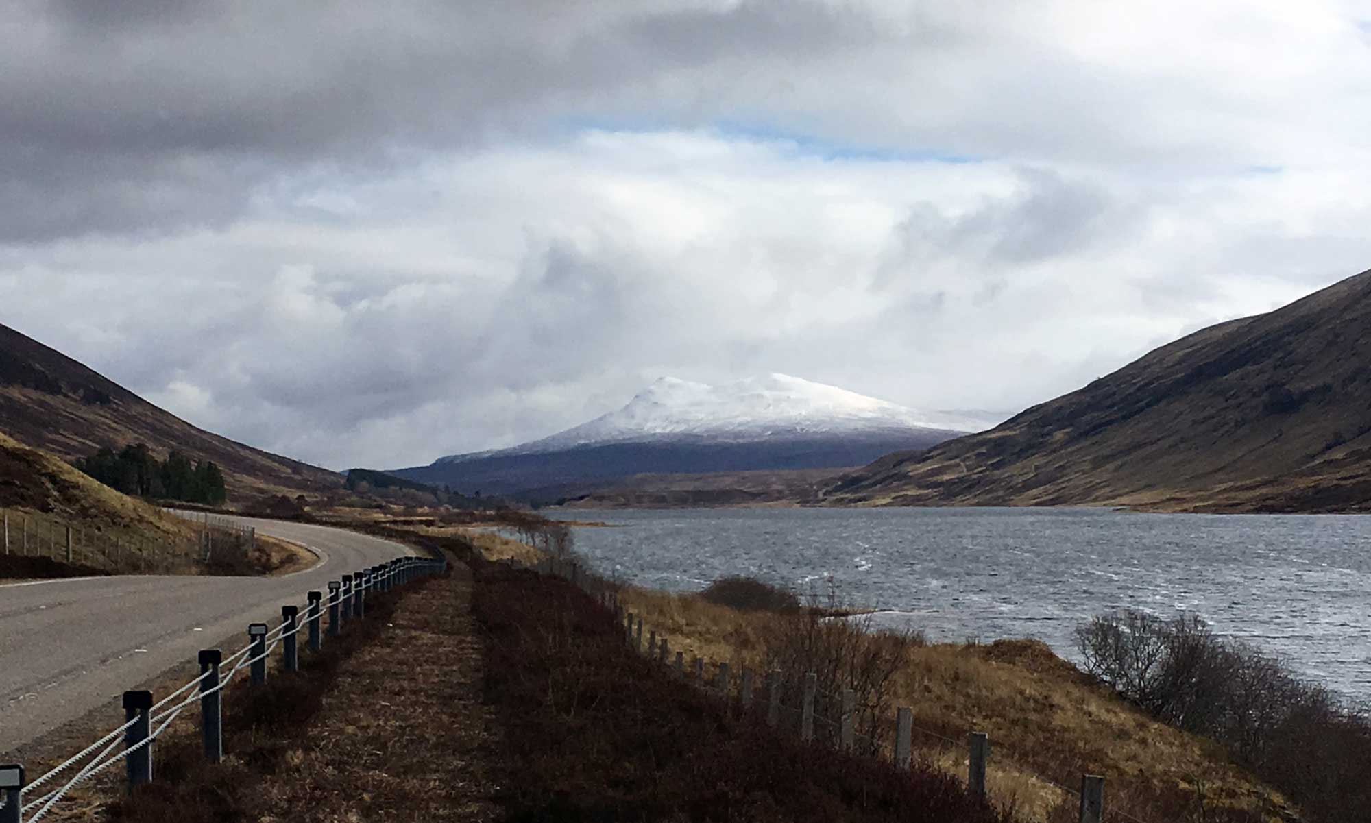 Es ist eine lange Fahrt, also nehme die „schnelle“ Strasse Richtung Inverness und komme wieder am Loch Maree vorbei, einmal ganz dran längs. Am Ende geht es einen steilen Pass hoch und oben angekommen sind wir nah an den schneebedeckten Bergen. Ich kann nicht anders und mache ein Foto von Strasse und Loch Chroisg.